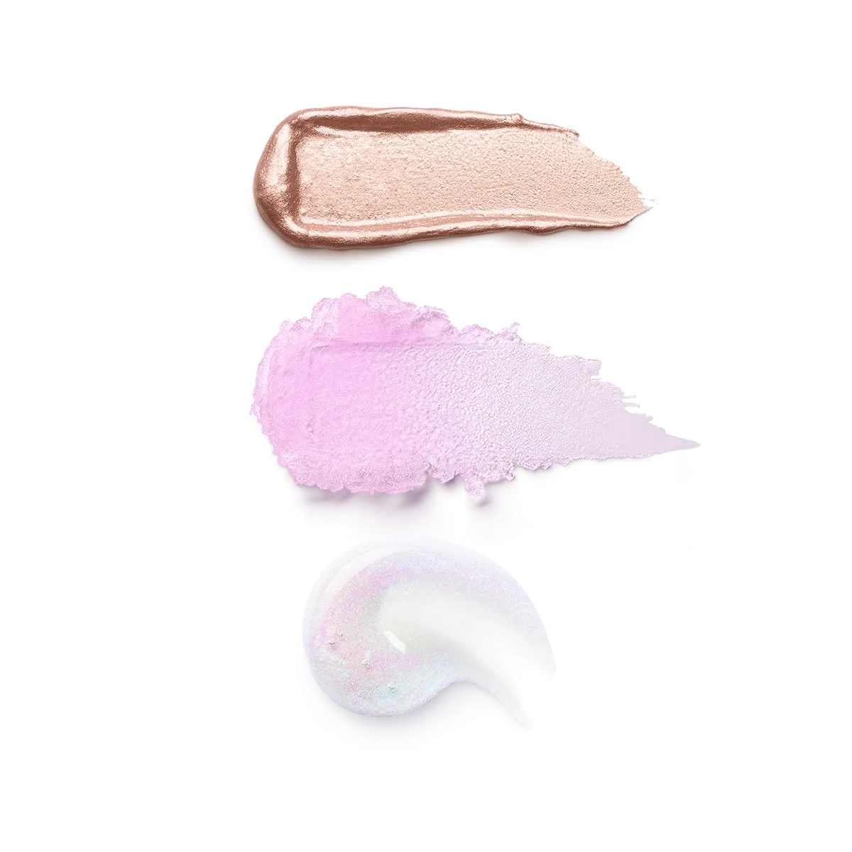 A complete Makeup Gift Set for eyes, face and lips, featuring pH-reactive cheek and lip stick, holographic liquid eyeshadow and lip oil, all presented in a super-cool fabric pouch..