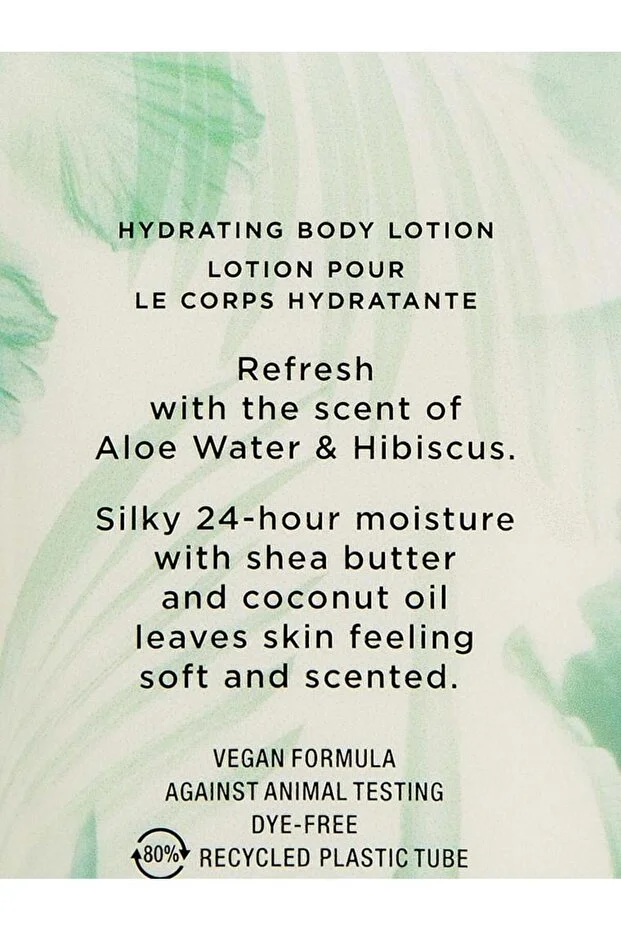 A new kind of daily body ritual. Hydrate with this silky Shea Butter- and Coconut Oil- infused formula for a soft feel and subtle scent. Simply smooth on for 24-hour moisture and subtle scent.Find balance with the scent of Victoria’s Secret Aloe Water & Hibiscus Natural Beauty Hydrating Body Lotion. It’s sheer rejuvenation.