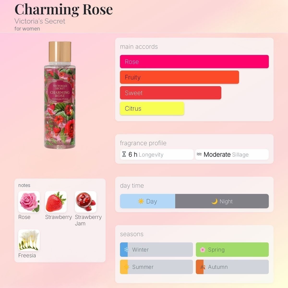 Очаровательный, сладкий и романтичный аромат, сочетающий сочность свежей клубники и нежность розы. Charming Rose окутывает теплом, лёгкостью и мечтательным настроением.